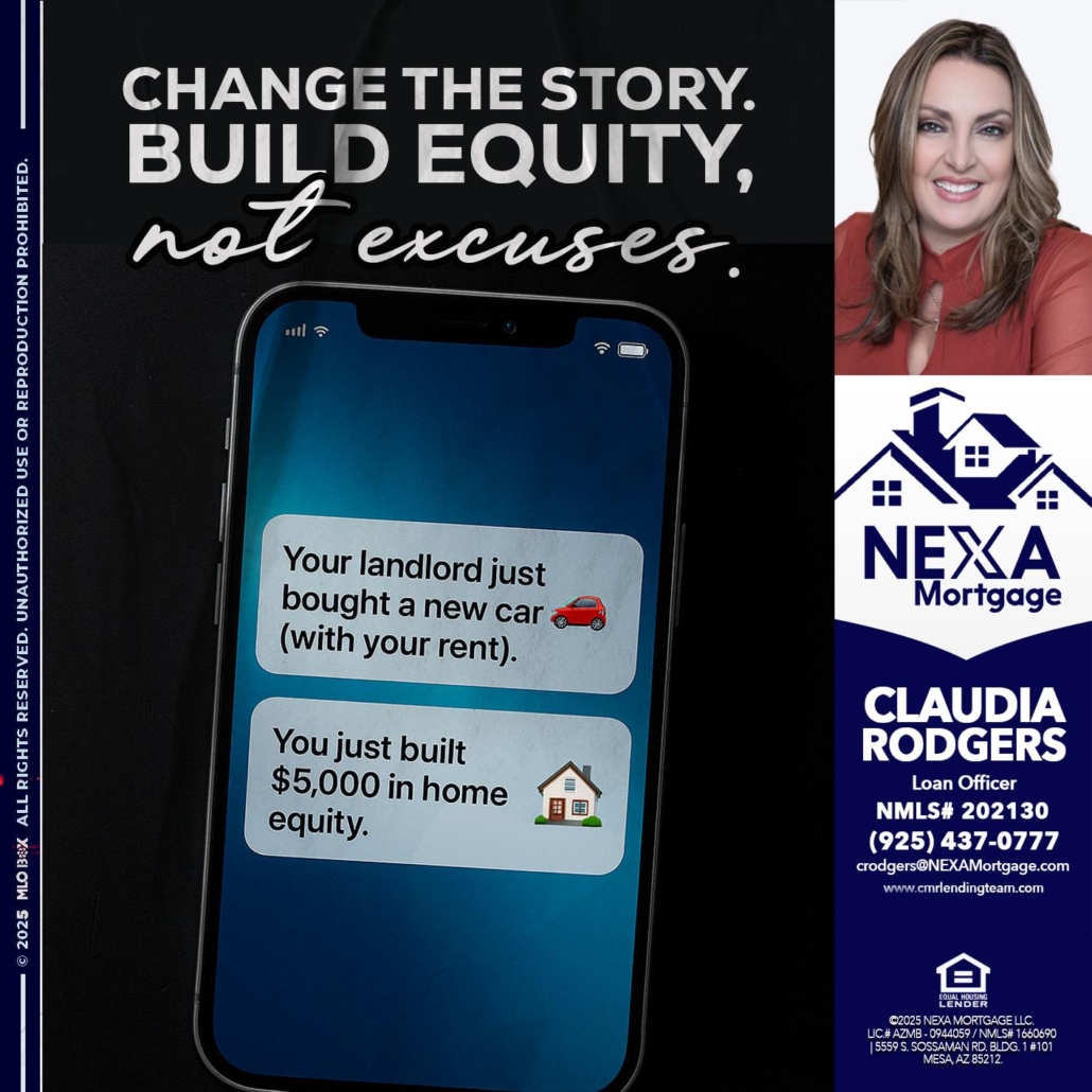 Hi, my name is Claudia Rodgers. I’m a Loan Officer with NEXA Mortgage LLC., offering personalized mortgage solutions, fast customized quotes, great rates and service with integrity.