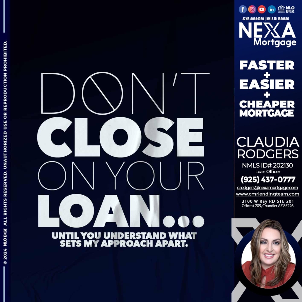 Hi, my name is Claudia Rodgers. I’m a Loan Officer with NEXA Mortgage LLC., offering personalized mortgage solutions, fast customized quotes, great rates and service with integrity.