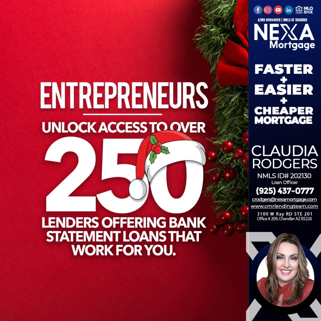 Hi, my name is Claudia Rodgers. I’m a Loan Officer with NEXA Mortgage LLC., offering personalized mortgage solutions, fast customized quotes, great rates and service with integrity.