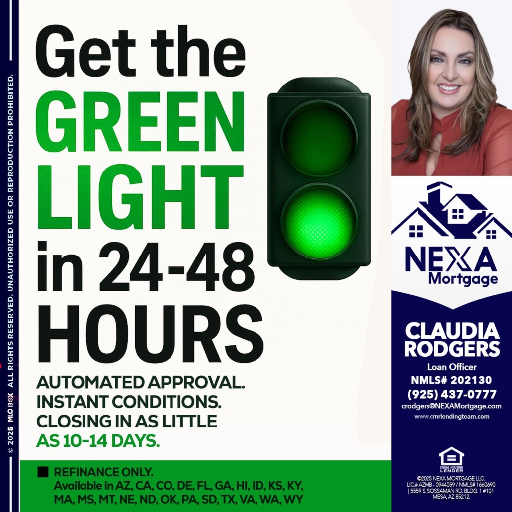 Hi, my name is Claudia Rodgers. I’m a Loan Officer with NEXA Mortgage LLC., offering personalized mortgage solutions, fast customized quotes, great rates and service with integrity.