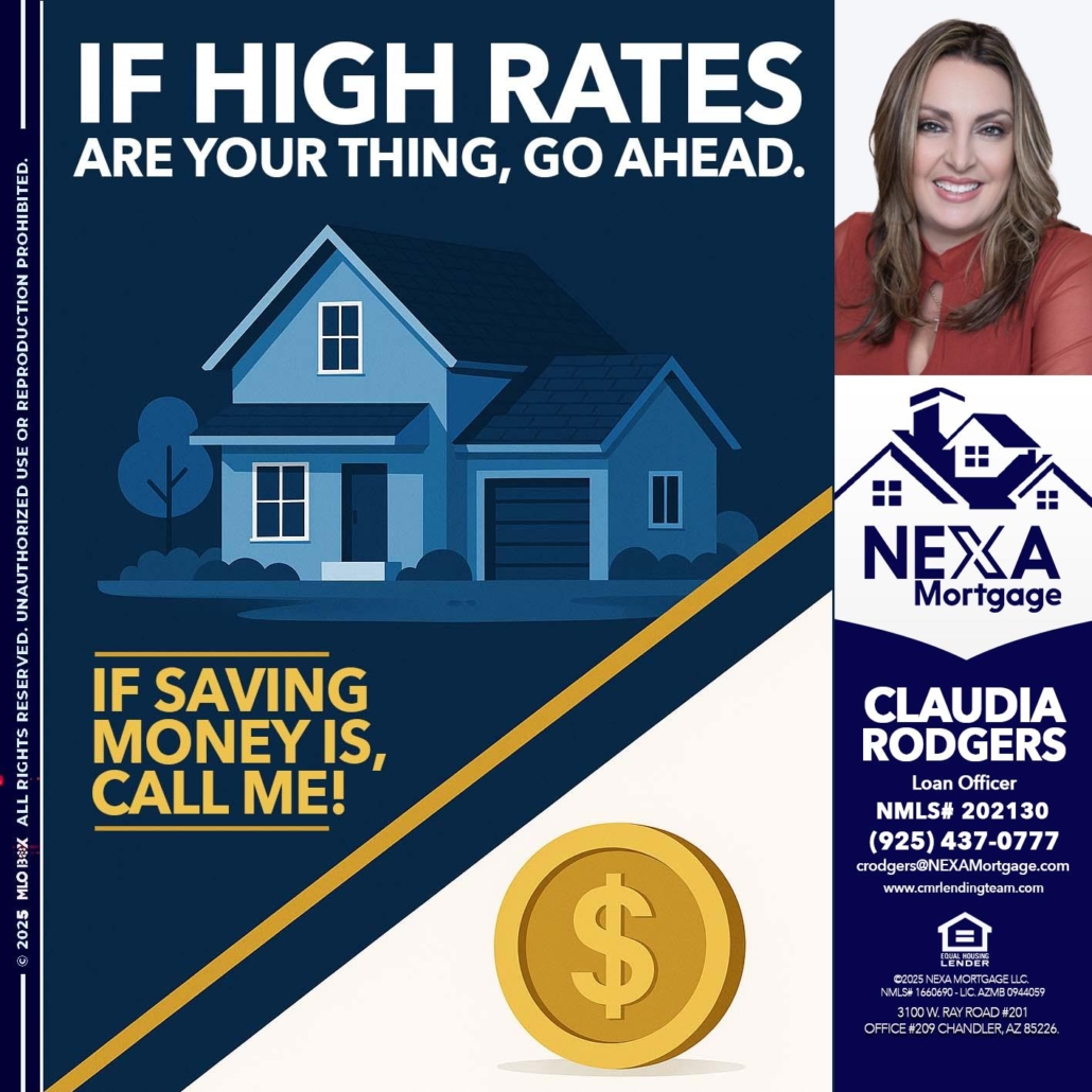 Hi, my name is Claudia Rodgers. I’m a Loan Officer with NEXA Mortgage LLC., offering personalized mortgage solutions, fast customized quotes, great rates and service with integrity.