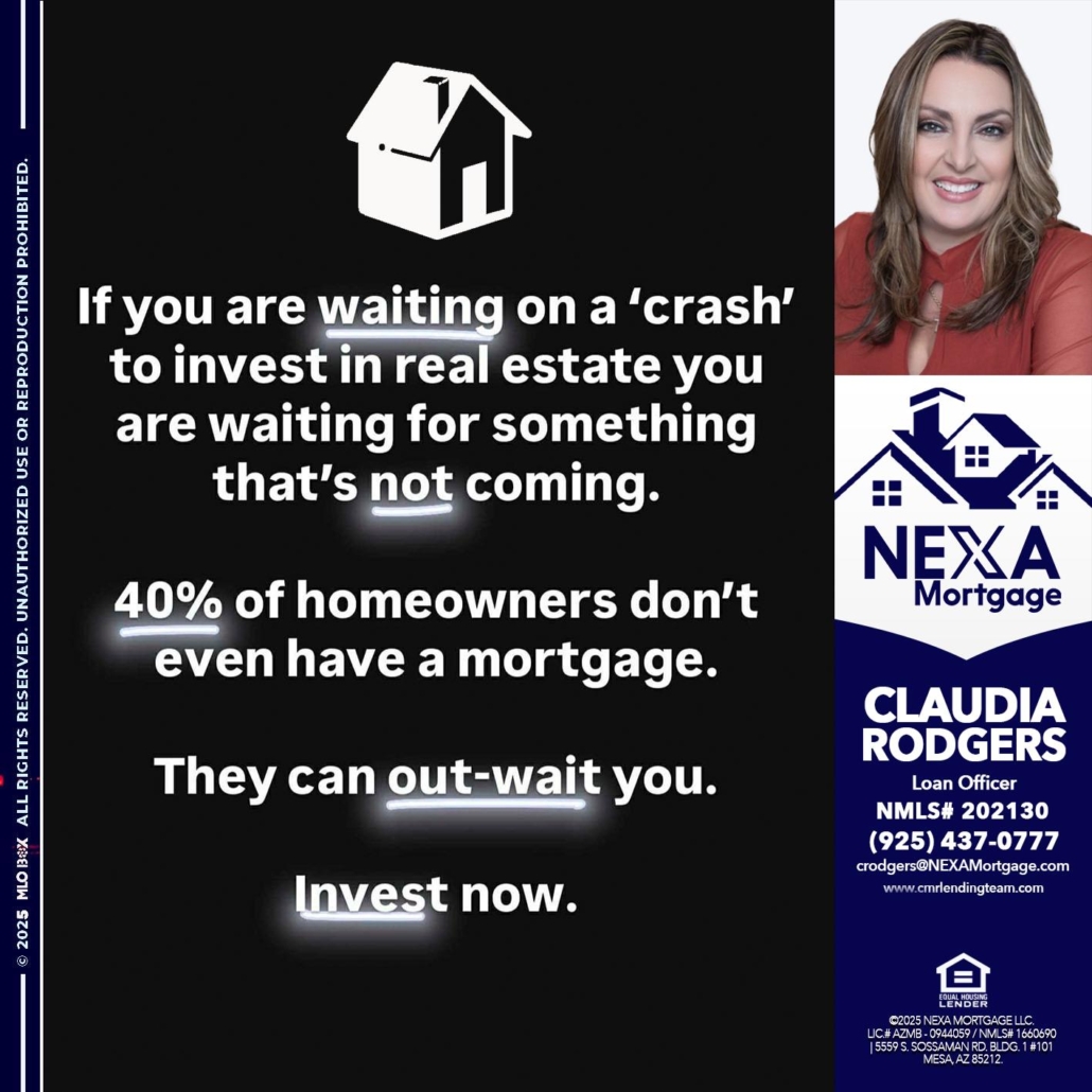 IF YOU ARE WAITING - Claudia Rodgers -Loan OfficerHi, my name is Claudia Rodgers. I’m a Loan Officer with NEXA Mortgage LLC., offering personalized mortgage solutions, fast customized quotes, great rates and service with integrity.