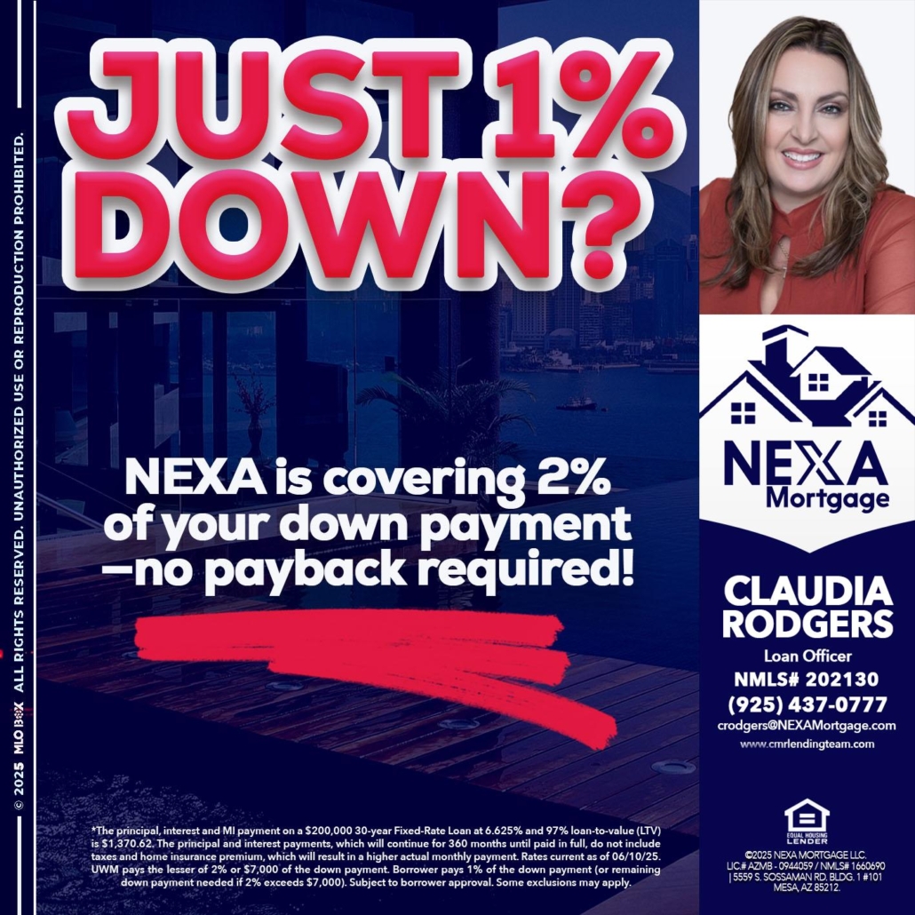 Hi, my name is Claudia Rodgers. I’m a Loan Officer with NEXA Mortgage LLC., offering personalized mortgage solutions, fast customized quotes, great rates and service with integrity.
