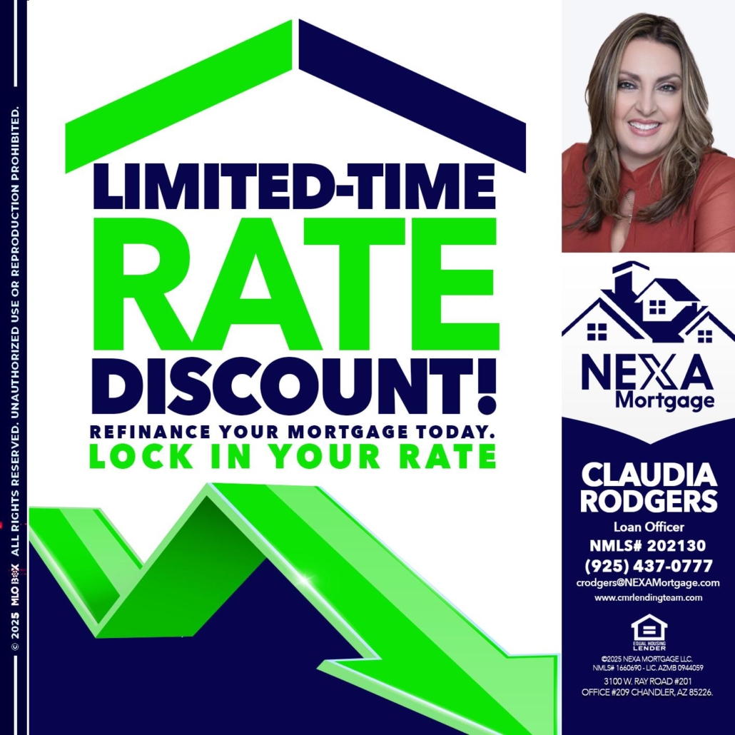 Hi, my name is Claudia Rodgers. I’m a Loan Officer with NEXA Mortgage LLC., offering personalized mortgage solutions, fast customized quotes, great rates and service with integrity.