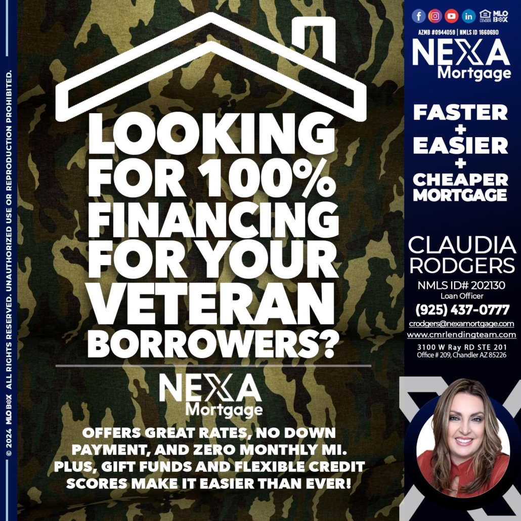 Hi, my name is Claudia Rodgers. I’m a Loan Officer with NEXA Mortgage LLC., offering personalized mortgage solutions, fast customized quotes, great rates and service with integrity.