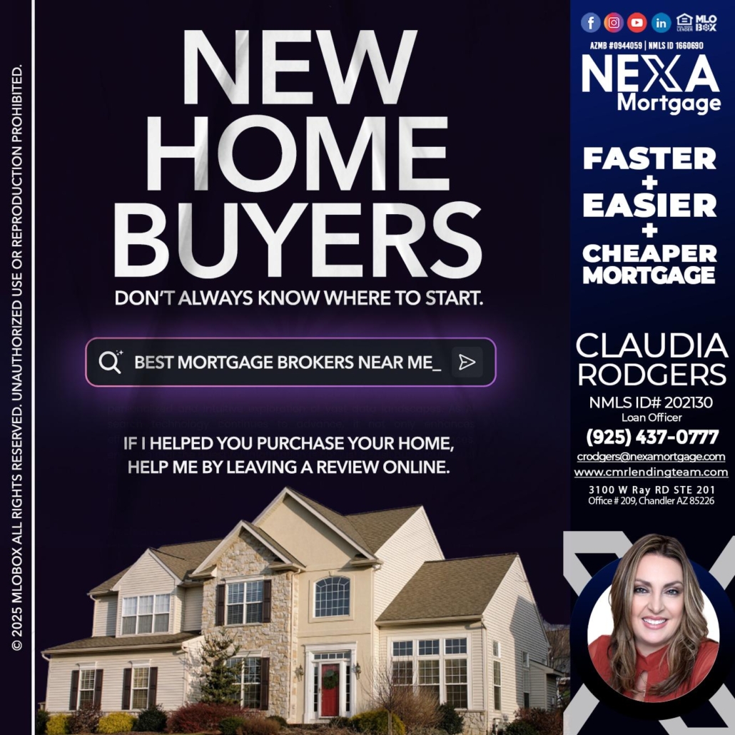 Hi, my name is Claudia Rodgers. I’m a Loan Officer with NEXA Mortgage LLC., offering personalized mortgage solutions, fast customized quotes, great rates and service with integrity.