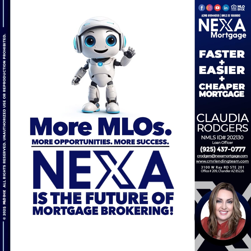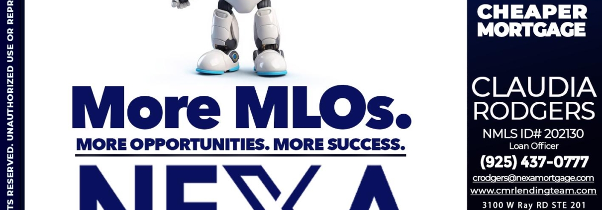 Hi, my name is Claudia Rodgers. I’m a Loan Officer with NEXA Mortgage LLC., offering personalized mortgage solutions, fast customized quotes, great rates and service with integrity.