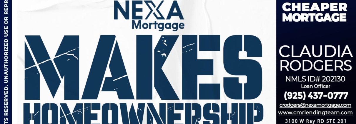 Hi, my name is Claudia Rodgers. I’m a Loan Officer with NEXA Mortgage LLC., offering personalized mortgage solutions, fast customized quotes, great rates and service with integrity.