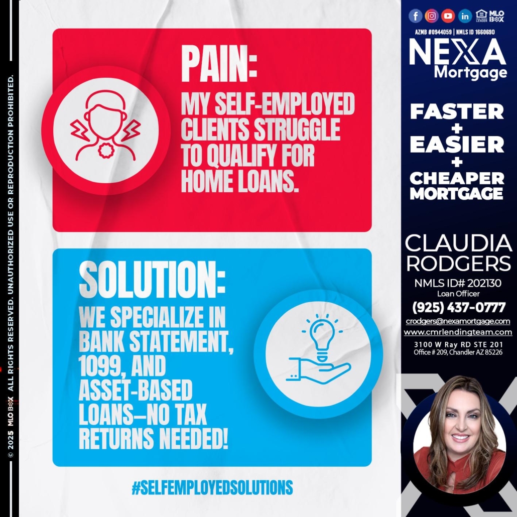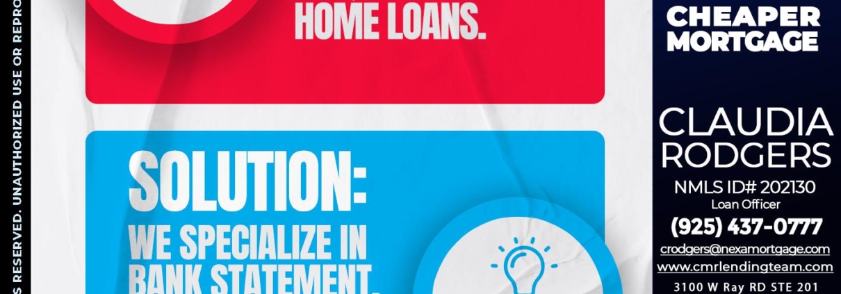 Hi, my name is Claudia Rodgers. I’m a Loan Officer with NEXA Mortgage LLC., offering personalized mortgage solutions, fast customized quotes, great rates and service with integrity.