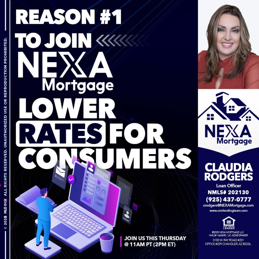 Hi, my name is Claudia Rodgers. I’m a Loan Officer with NEXA Mortgage LLC., offering personalized mortgage solutions, fast customized quotes, great rates and service with integrity.