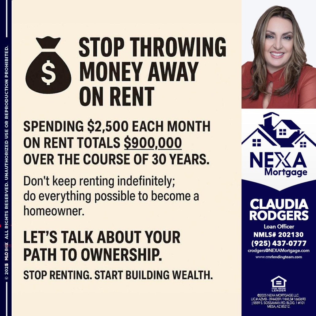 Hi, my name is Claudia Rodgers. I’m a Loan Officer with NEXA Mortgage LLC., offering personalized mortgage solutions, fast customized quotes, great rates and service with integrity.