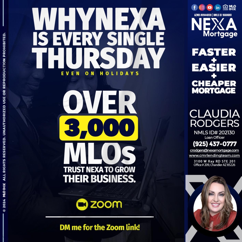 why NEXA - Claudia Rodgers -Loan OfficerHi, my name is Claudia Rodgers. I’m a Loan Officer with NEXA Mortgage LLC., offering personalized mortgage solutions, fast customized quotes, great rates and service with integrity.