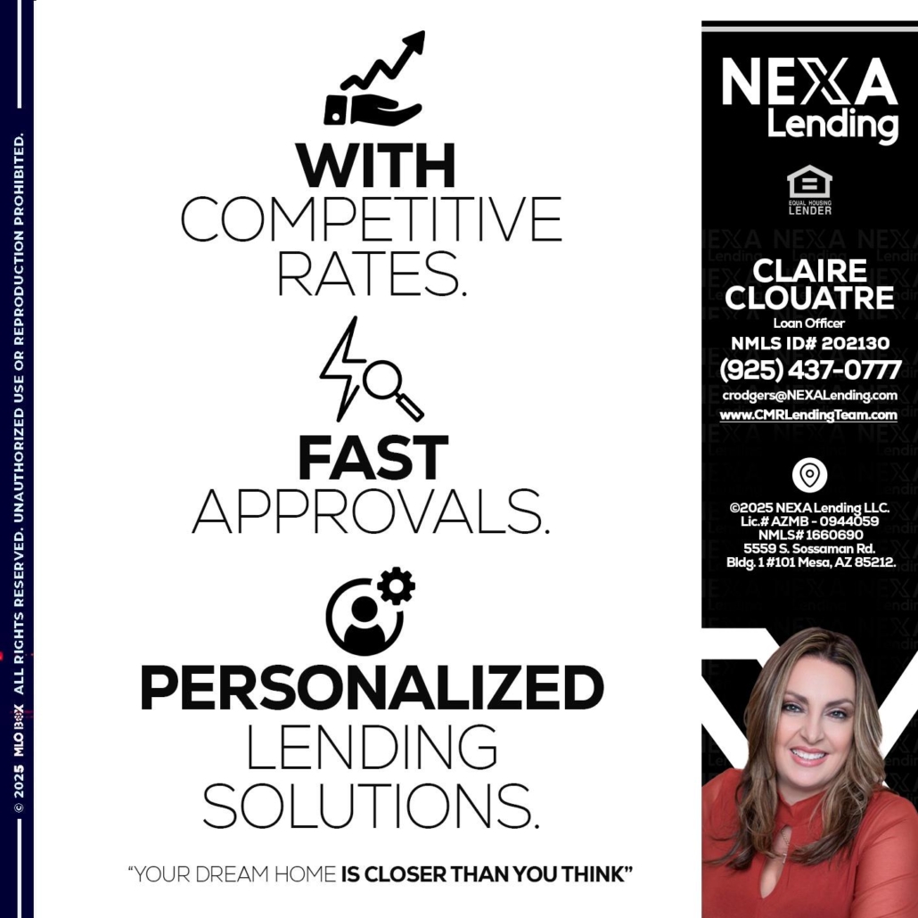 Hi, my name is Claudia Rodgers. I’m a Loan Officer with NEXA Mortgage LLC., offering personalized mortgage solutions, fast customized quotes, great rates and service with integrity.