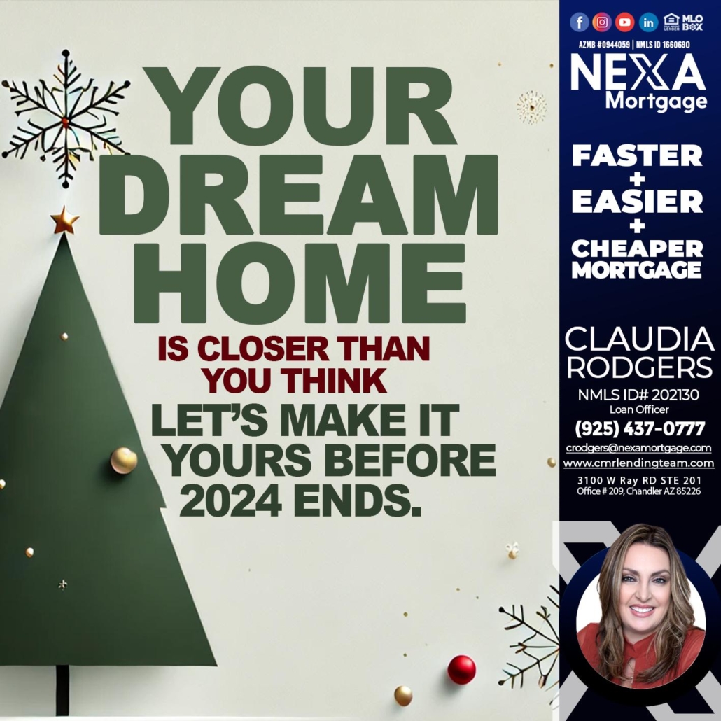 Hi, my name is Claudia Rodgers. I’m a Loan Officer with NEXA Mortgage LLC., offering personalized mortgage solutions, fast customized quotes, great rates and service with integrity.
